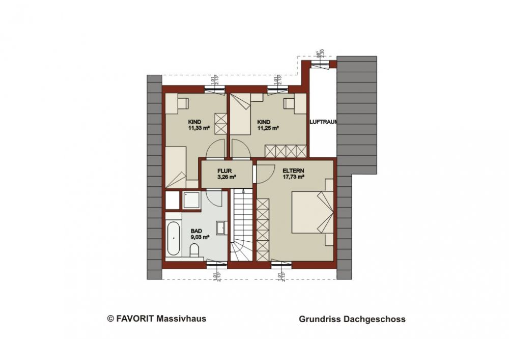 Auch in einem kleinen Massivhaus kann viel Platz für alle Familienmitglieder vorhanden sein. Voraussetzung hierfür ist ein perfekt geplanter Grundriss. Im Erdgeschoss wartet auf Sie eine großzügige Küche und ein schön gestalteter Wohn- und Essbereich. Der Hauswirtschaftsraum im Erdgeschoss bietet genug Platz für die Haustechnik, Waschmaschine und Trockner. Über die L-förmige Treppe gelangen Sie zu den Schlafräumen und dem Bad im Dachgeschoss. Die Kinderzimmer sind großzügig geschnitten und bieten auch den Platz für große Wäscheschränke. Im Elternschlafzimmer findet auch eine „Kleiderwand“ Platz.