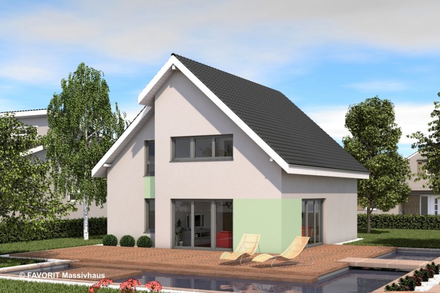 Offene Raumkonzepte und Lichtdurchflutetes Wohnen, dass ermöglicht das FAVORIT Haus Noblesse 120. Durch einen großzügig gestalteten Dielenbereich erreicht man das offene Wohn-/ Esszimmer mit seinem nach oben offenen Wintergartenerker, sowie die zum Garten hin orientierte große Küche. Ein Hauswirtschaftsraum und ein Gäste WC sind ebenfalls im EG untergebracht. Im Dachgeschoss findet sich neben einem wirtschaftlichen Flurbereich Platz für 2 Kinderzimmer, ein großes Elternschlafzimmer sowie ein Familienbad. Die Fassade öffnet sich mit seinen Fenstern zum Garten und lässt viel Raum für das familiäre „Wohlfühlwohnen“.